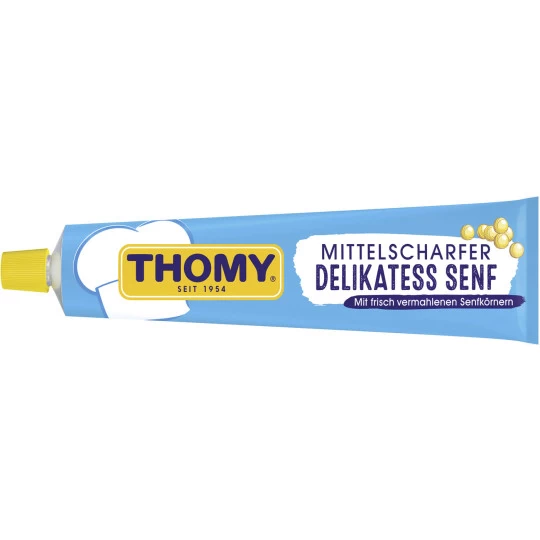 THOMY Mittelscharfer Delikatess-Senf ist einer der beliebtesten Senfarten Deutschlands. Produziert nach dem THOMY Sorgfaltsprinzip: Hochwertige Zutaten, schonende Verarbeitung und größte Sorgfalt bei der Herstellung. Besonders fein vermahlen aus braunen und gelben Senfkörnern der Güteklasse A für den unwiderstehlich cremigen THOMY Geschmack. Natürlich ohne Konservierungsstoffe.
