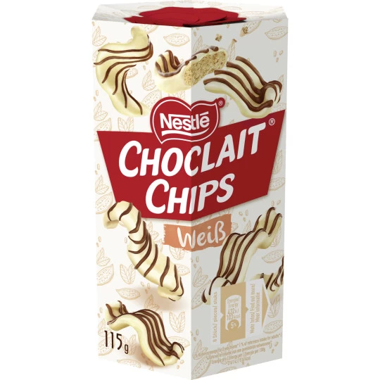 CHOCLAIT CHIPS® – Lass es knuspern! Feine Knusperchips mit zarter Mandelnote, umhüllt mit weißer Schokolade und verfeinert mit Dekorstreifen aus Milchschokolade – das sind die CHOCLAIT CHIPS® Weiß! Die Kombination aus knusperleichtem Kern und leckerer Schokolade macht sie zu einem ganz besonderen Snack-Erlebnis und damit perfekt für alle, die es beim Snacken gerne mal leicht nehmen. Auch ihre einzigartige Form macht einfach immer wieder Lust auf CHOCLAIT CHIPS® Weiß. Für Fans von weißer Schokolade genau das Richtige! Immer frisch und knusprig In der beliebten sechseckigen und wiederverschließbaren Faltschachtel (115 g) sind die leckeren CHOCLAIT CHIPS® dank frischeversiegeltem Beutel natürlich immer frisch und knusprig.